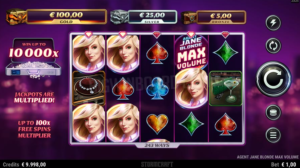 There are three jackpots in Agent Jane Blonde Max Volume, along with Rolling Reels, free spins with multipliers, and free spins with a multiplier trail.